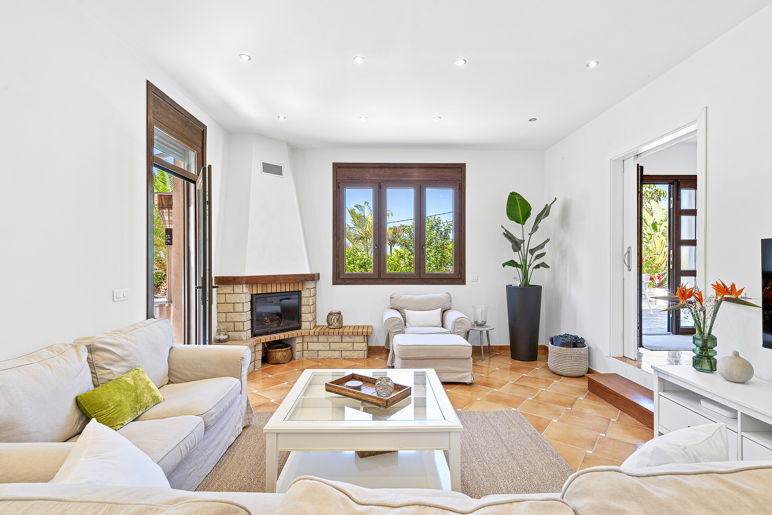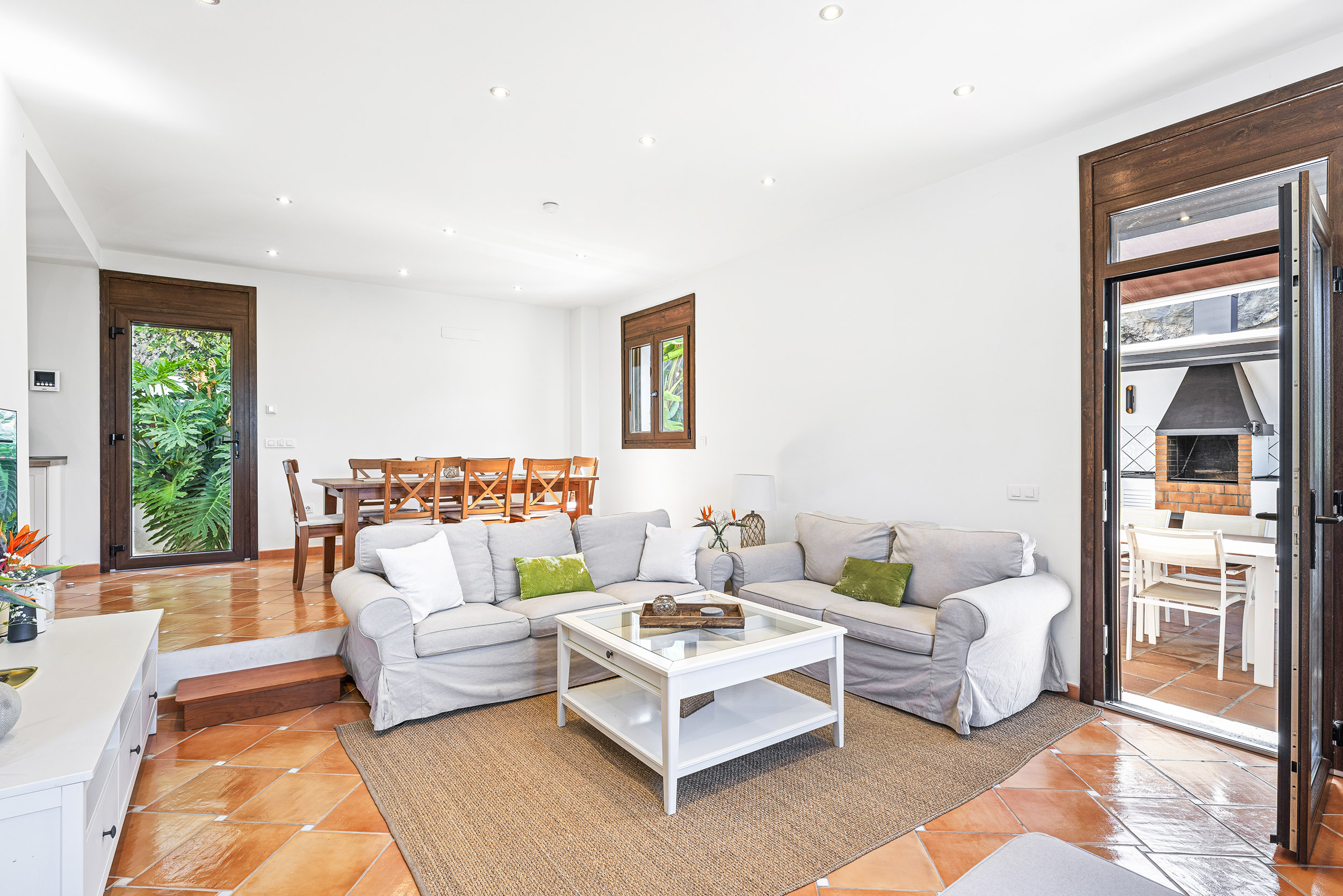 Das große, lichtdurchflutete Wohnzimmer bietet eine gemütliche Couchgarnitur,