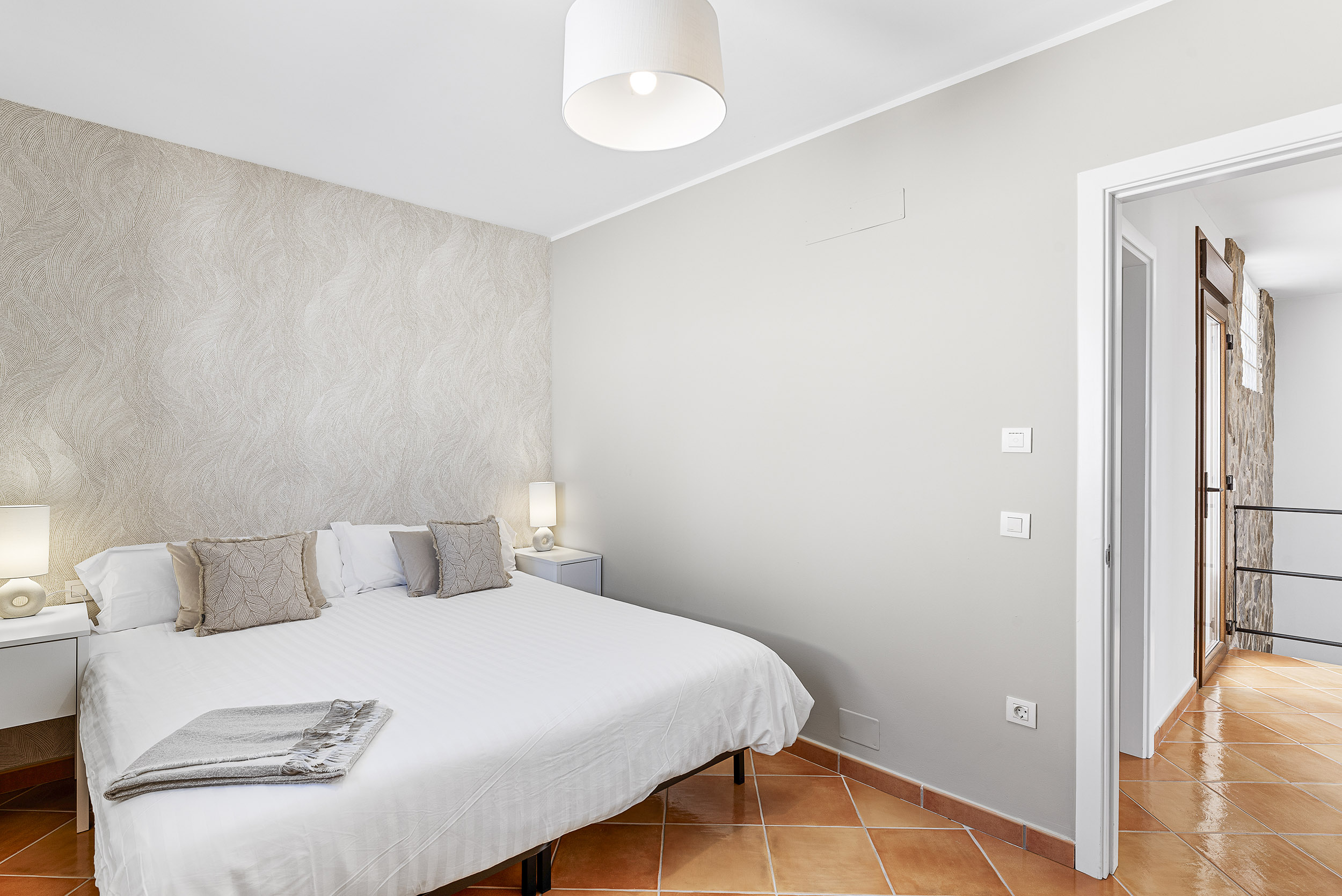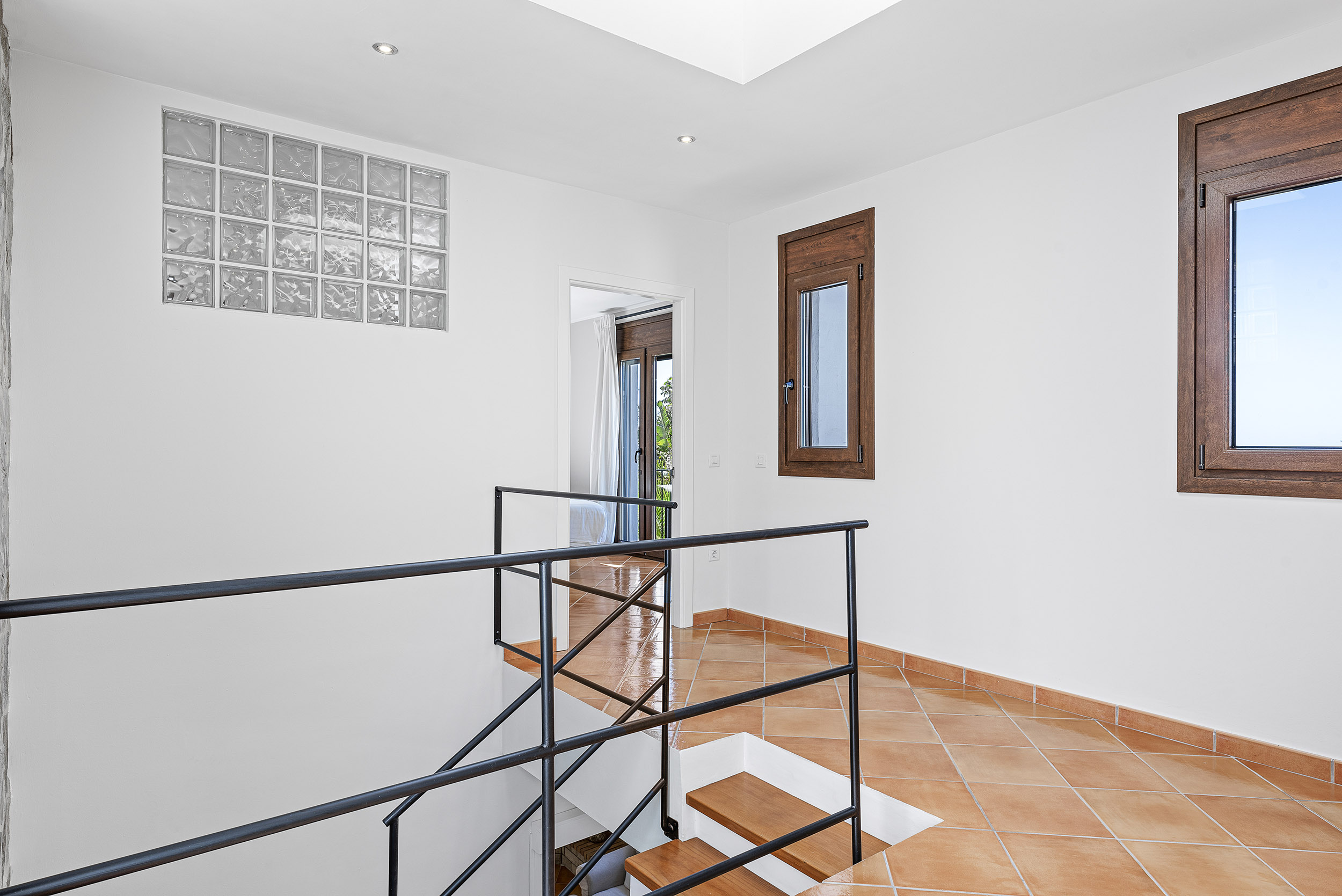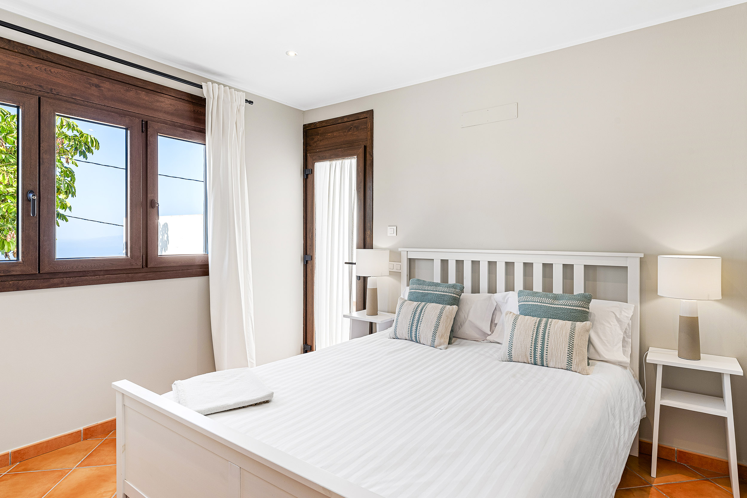 Ein weiteres Schlafzimmer mit einen Doppelbett und einem Badezimmer mit Badewanne befindet sich auf der gleichen Etage sowie ein Büro mit Meeresblick -ein ideales Home-Office 😉. Zusätzlich gibt es im oberen Bereich eine kleine uneinsehbare Terrasse. z.B. für FKK-Yoga.