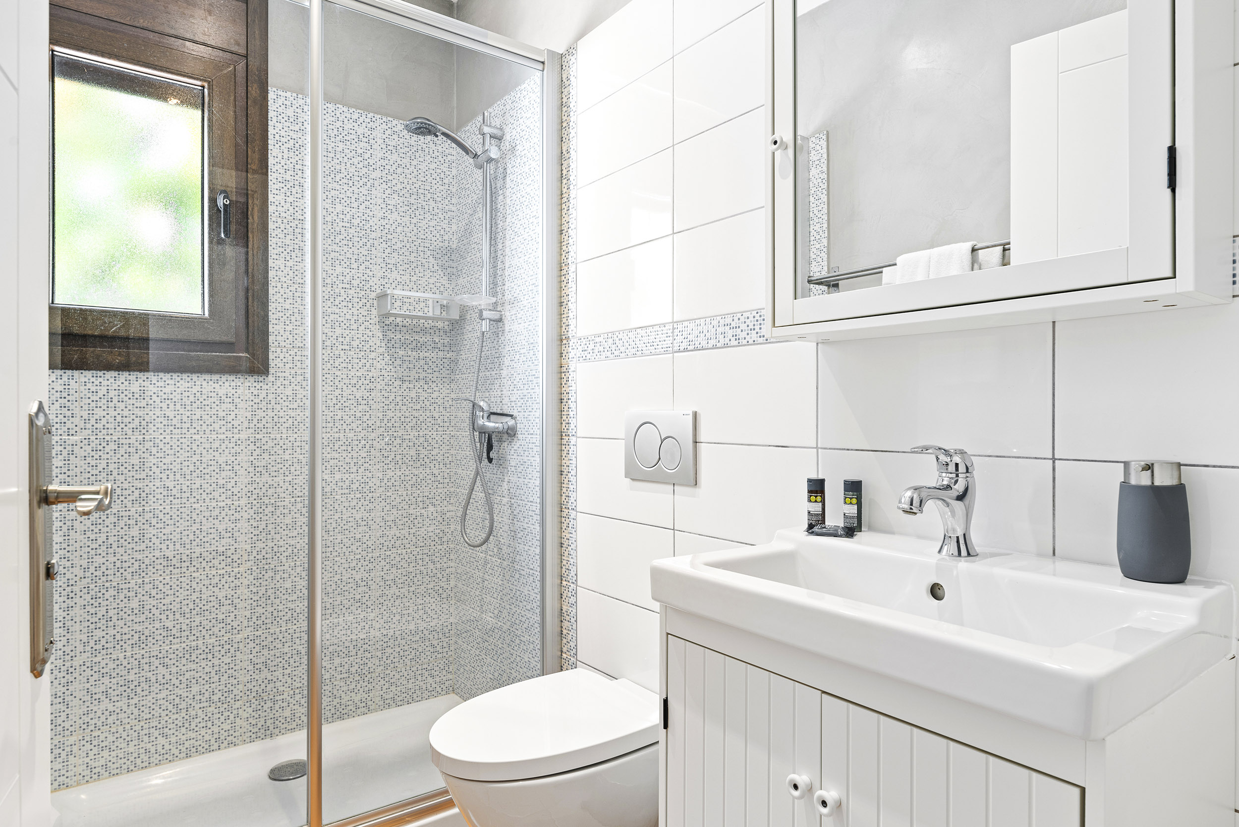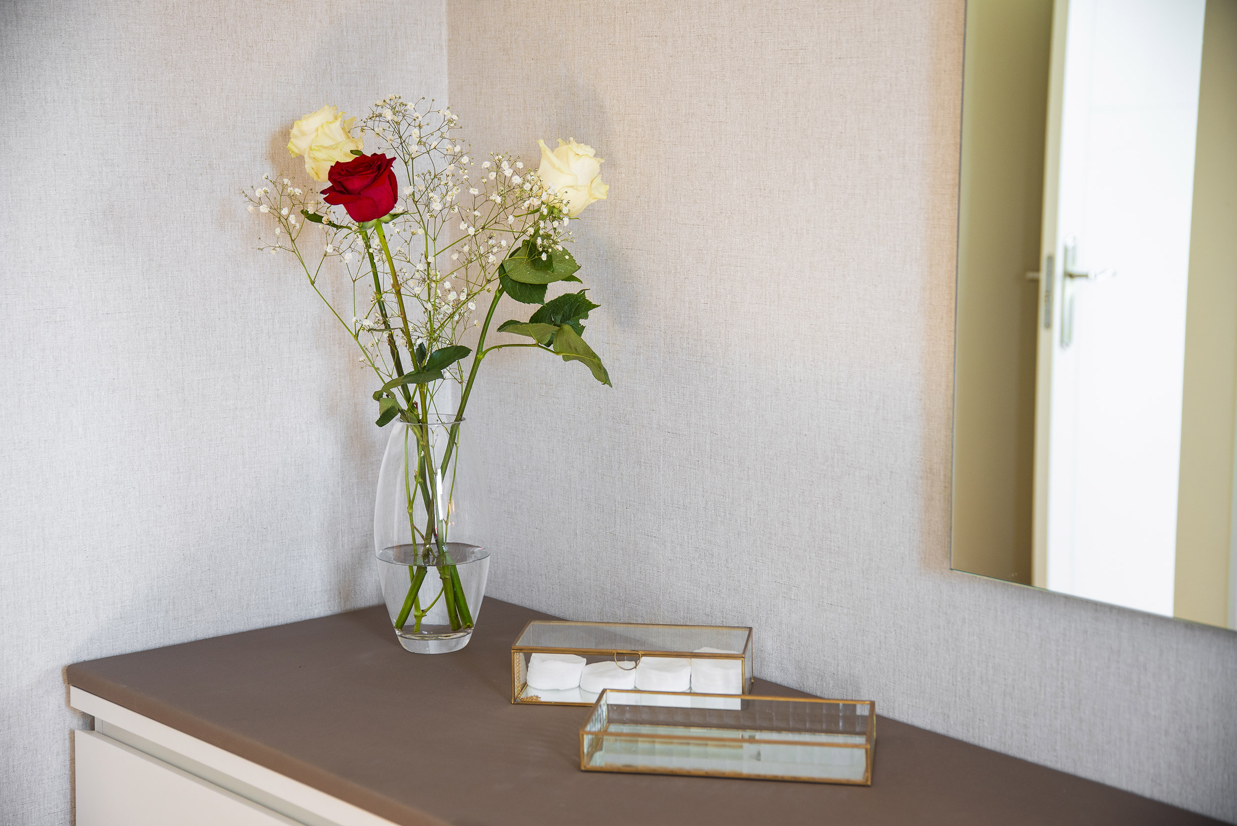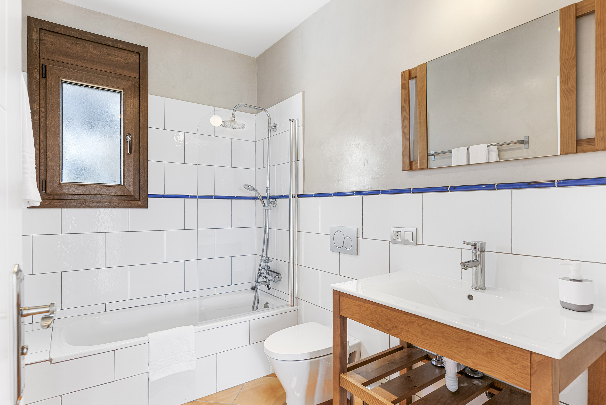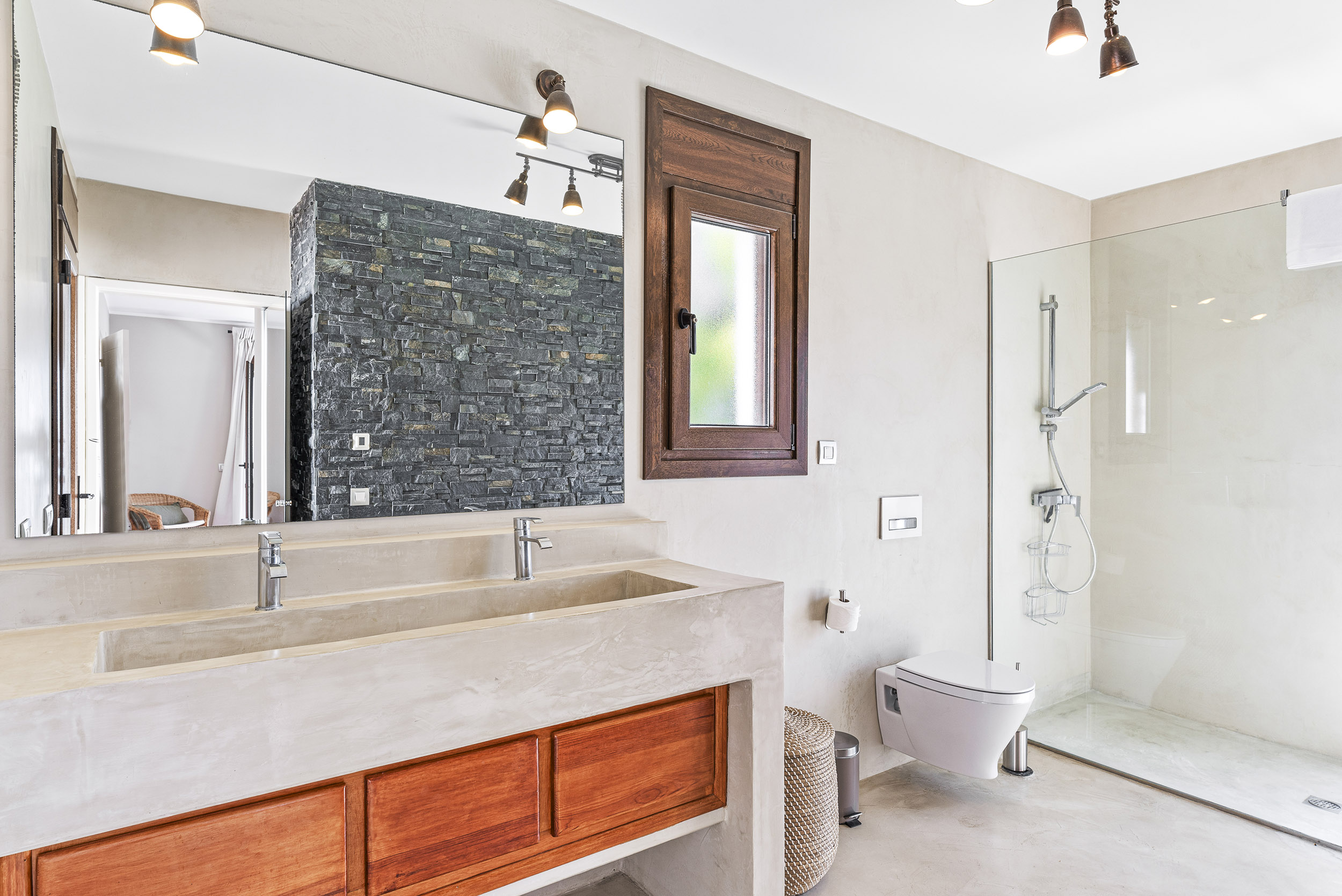 In der oben Etage befindet sich ein Schlafzimmer en Suite mit begehbarem Kleiderschrank (mit Safe) und ein anschliessendes, grosszügiges Badezimmer mit ebenerdiger Dusche, Doppelwaschbecken und WC.
